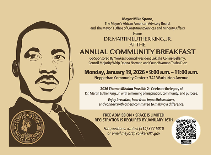 YONKERS – Yonkers Mayor Mike Spano, the Mayor’s African American Advisory Board and the Mayor’s Office of Constituent Services and Minority Affairs, together with co-sponsors Yonkers Council President Lakisha Collins-Bellamy, Council Majority Whip Deana Norman and Councilwoman Tasha Diaz, will host the annual MLK Community Breakfast on Monday, January 19, 2025, from 9AM to 11AM at the Nepperhan Community Center located at 342 Warburton Avenue, Yonkers.