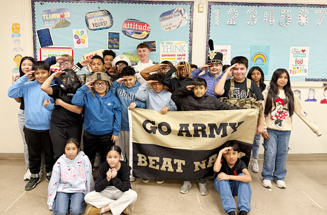 NEWBURGH – Cadet Mellon visited HMS and spoke to Ms. Coopersmith’s students. Using a slide show he taught them about the United States Military Academy at West Point, and what it’s like to be in the army. He showed them noble figures who attended West Point and others who visited to speak to and motivate the cadets.
